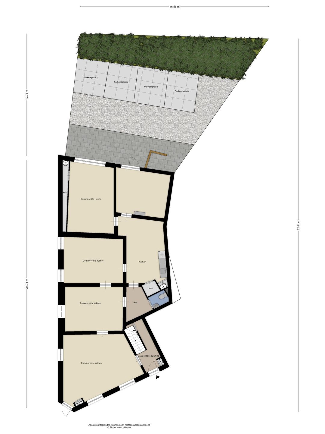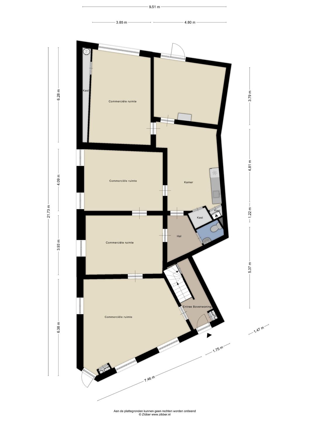 Aansluitend is een centrale ruimte met een kitchenette, een bergkast en een kast met de HR-ketel. In de aansluitende hal, aan de linkerzijde, is een toiletruimte. Er zijn vier commerciële ruimtes op de begane grond, klaar voor een nieuwe invulling. Grote ramen zorgen voor veel lichtinval en de afwerking is fraai, met een lichte tegelvloer en stucwerk. In de ruimte aan de achterzijde is het mogelijk om de pui met ramen te vervangen door een garagepoort, die er voorheen ook gezeten heeft.