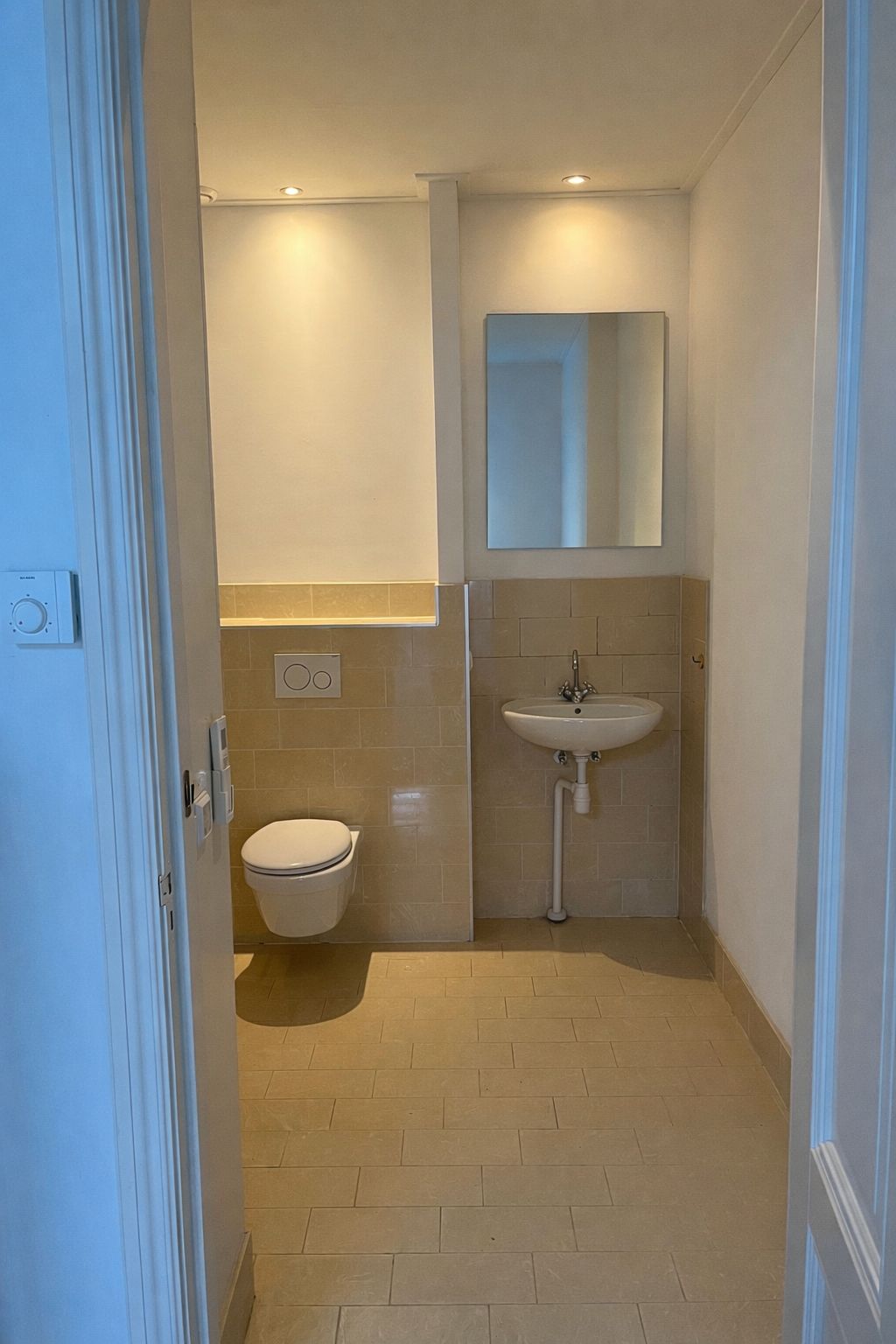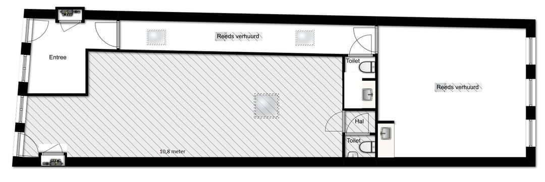 Bij binnenkomst is er een ontvangstruimte gevolgd door een mooie rechthoekige ruimte met achterin een ruime toiletruimte met wastafel.