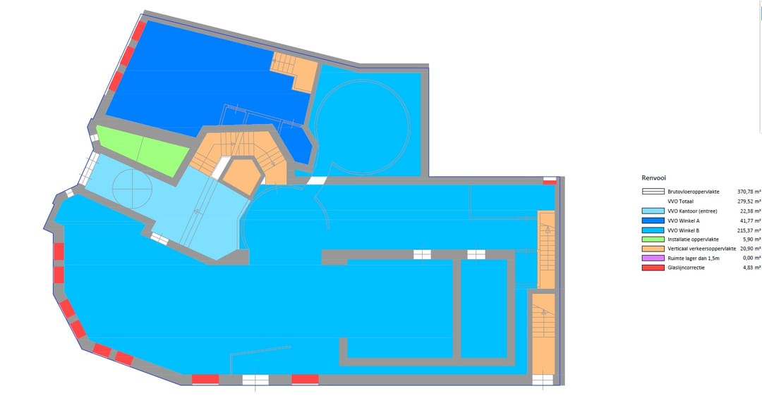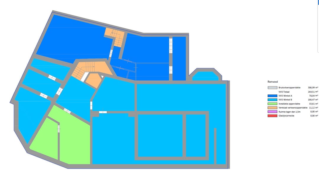 Voor verhuur is totaal ca. 401 m² beschikbaar verdeeld over de begane grond (ca. 215 m² VVO) en de kelder (ca. 186 m² VVO).