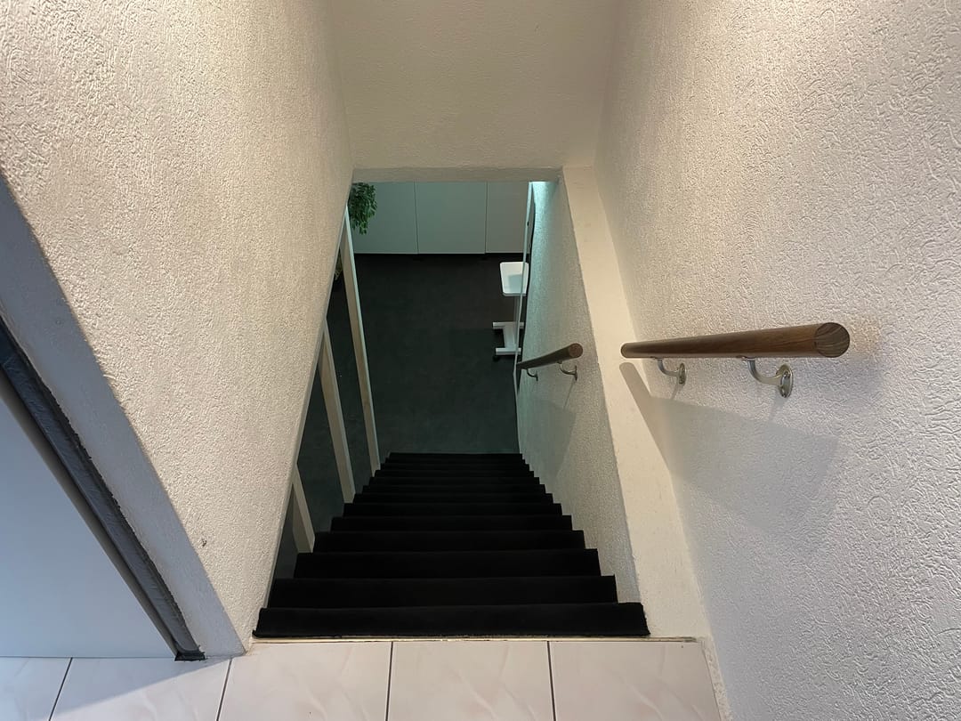 In de kelderruimte zijn drie kamers gecreëerd met glad gestucte wanden en strakke plafonds met verlichtingsarmaturen.
