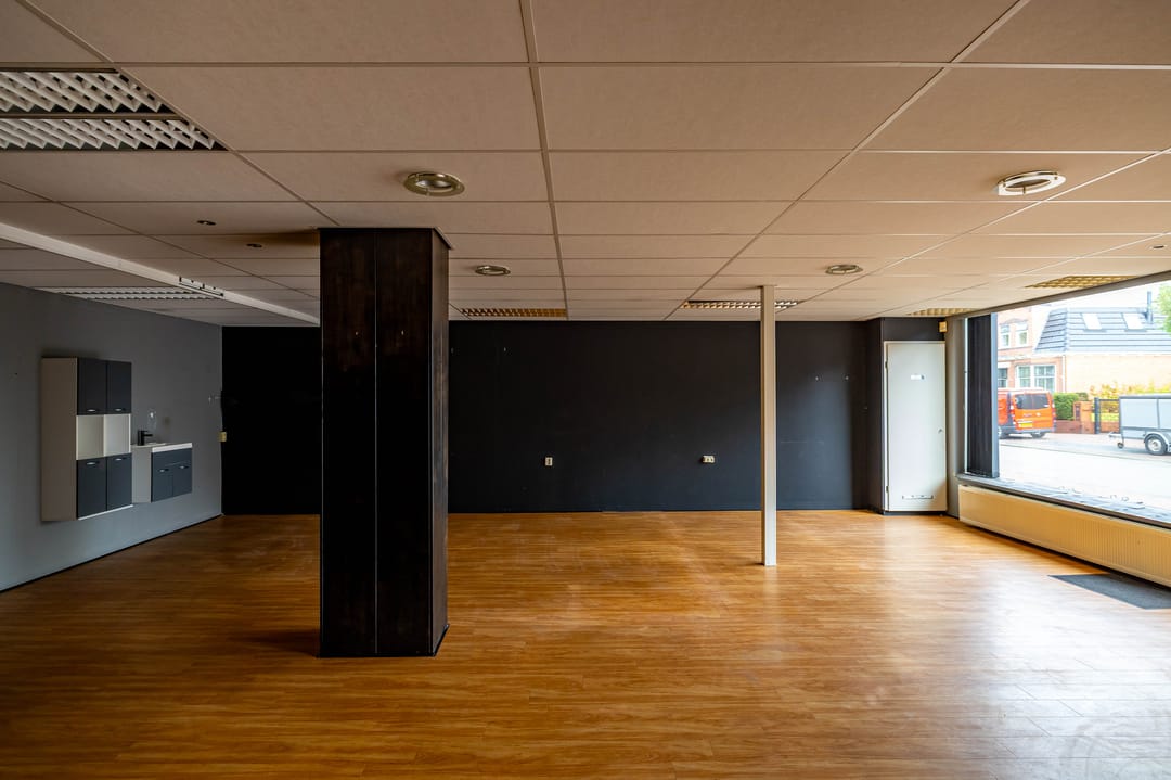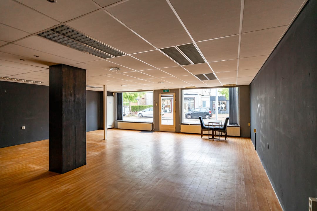 Entree gevolgd door een winkelruimte 75,5 m2 voorzien van een systeemplafond en dubbelglas; via de winkel is een opslag/kantoorruimte 21,3 m2 met zowel de plaats van de CV-installatie als toegang tot een bergruimte waar zich tevens het toilet bevindt.
