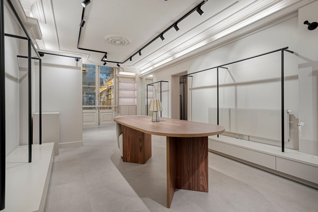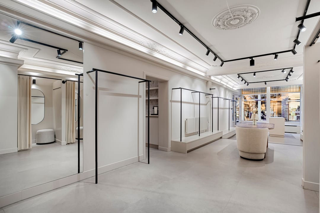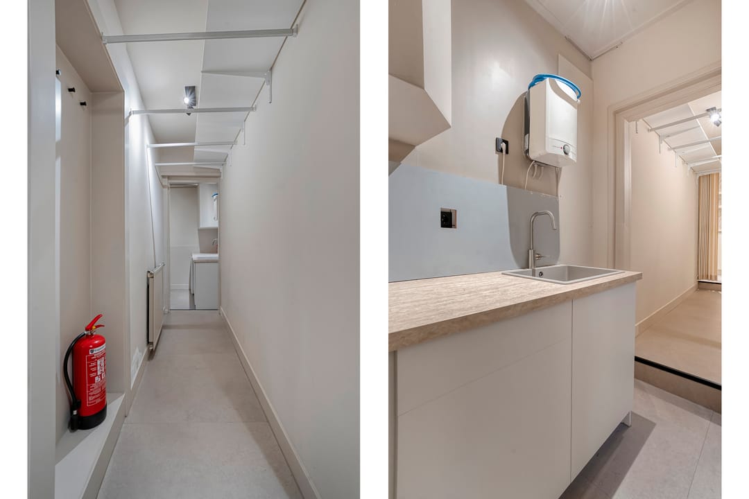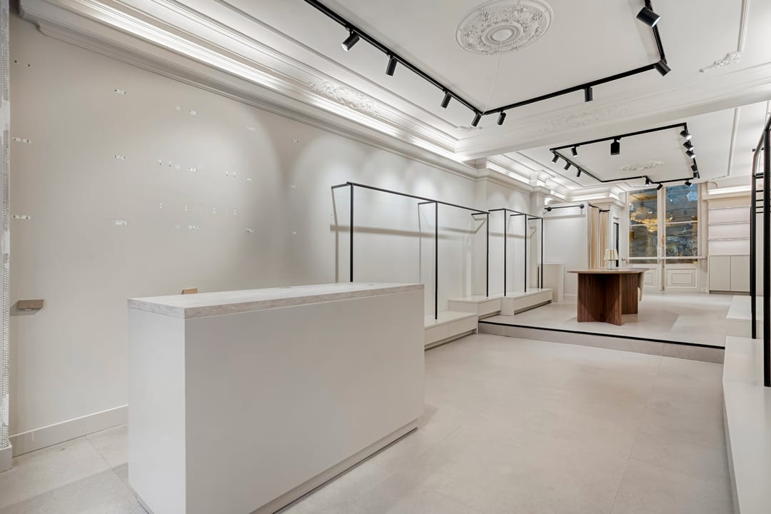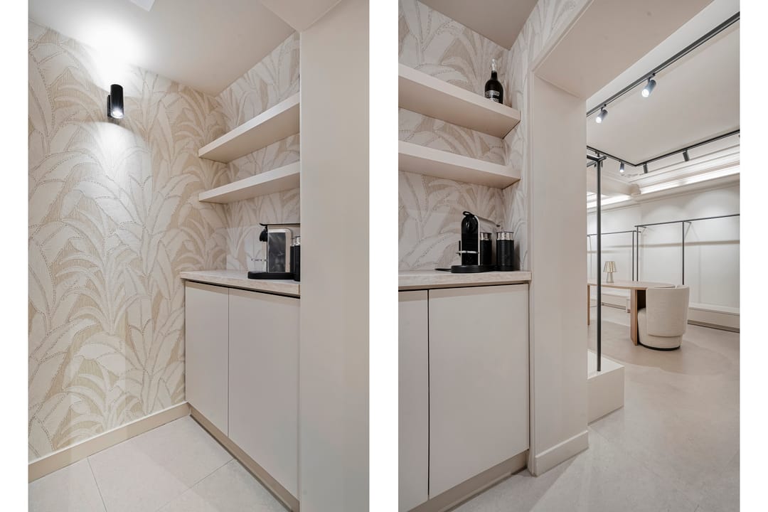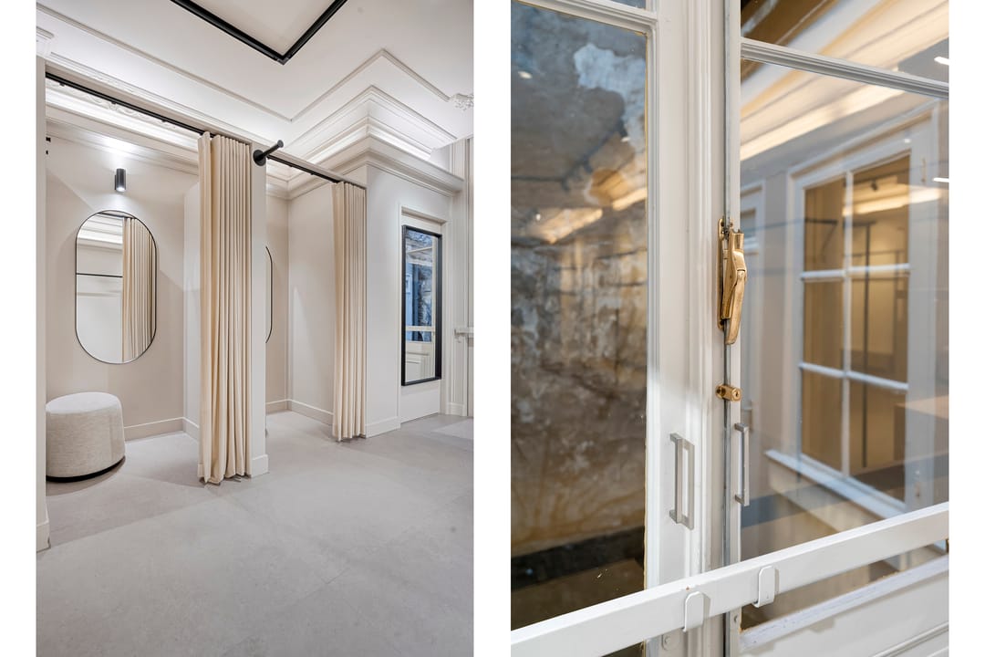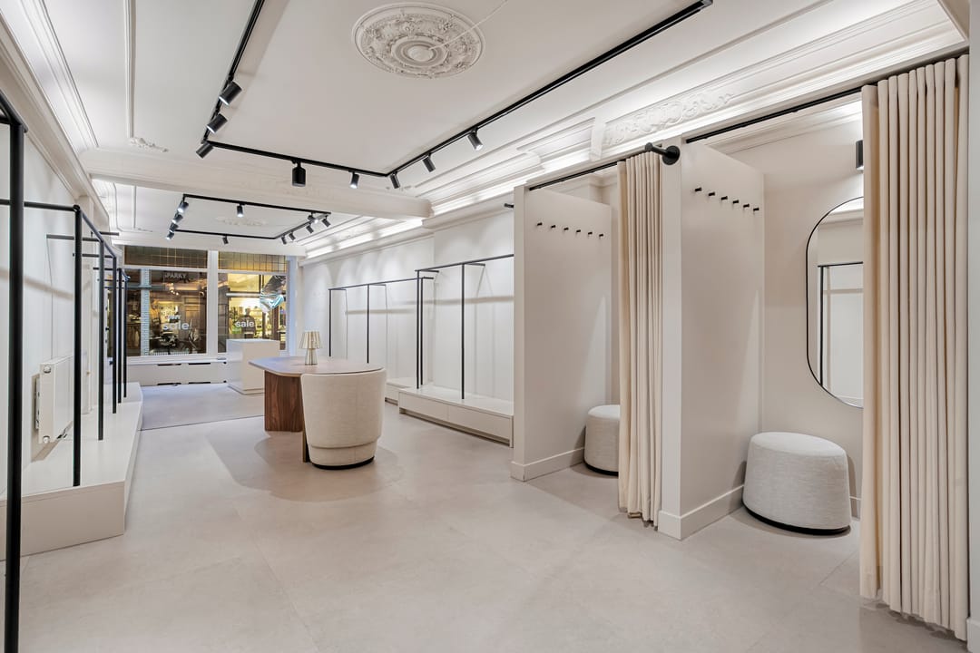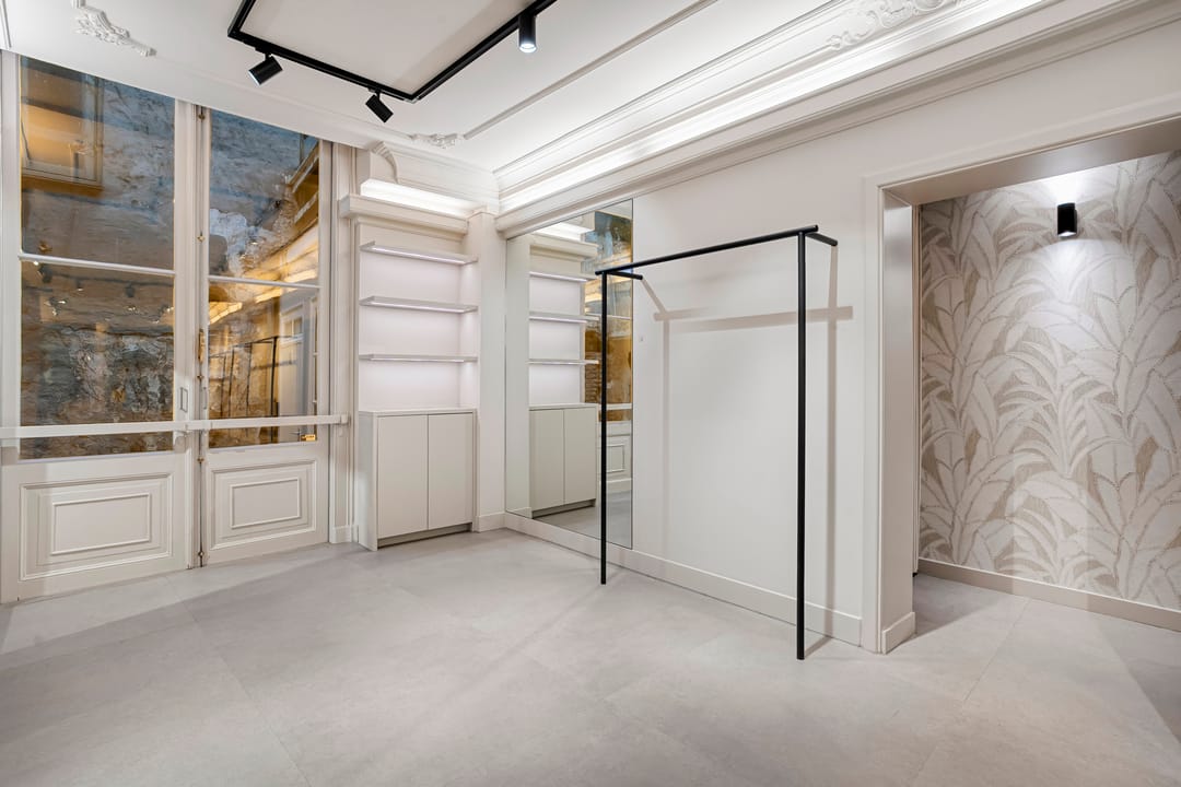 De winkel is recent volledig gerenoveerd en biedt 50 m² lichte verkoopruimte en 10 m² voor opslag/pantry. De openslaande deuren aan de achterzijde kijken uit op de binnenplaats en zorgen voor prettig licht.