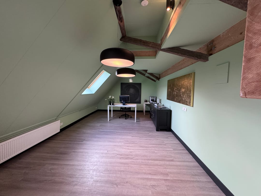 De ruimten kenmerken zich door een zichtbare kapconstructie, authentieke details en een prettige lichtinval dankzij moderne Velux-dakramen. De combinatie van historie en comfort zorgt voor een warme, professionele uitstraling die u zelden tegenkomt in het huidige aanbod.