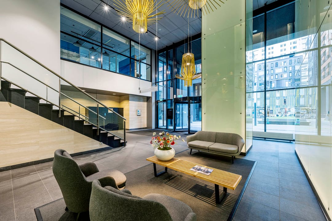 Symphony Offices beschikt over een 24/7 bemande receptie / hospitality desk in de hoge entree. De lobby is in 2020 volledig gerenoveerd en biedt nu een koffiecorner en informele zit- en break out ruimtes. Naast het hospitality en security team is er een onsite gebouwbeheerder die verantwoordelijk is voor de dagelijkse gang van zaken en het eerste contact met de huurders van het gebouw.