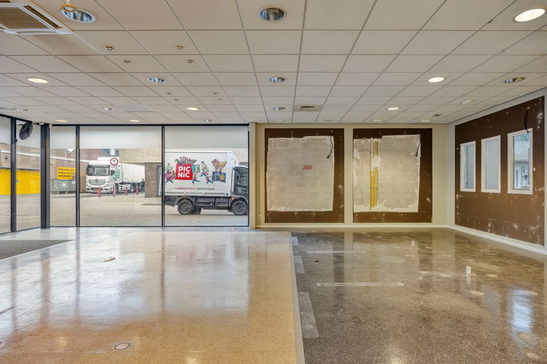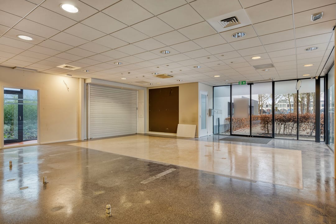 De ruimte bestaat uit een open ruimte met twee afgescheiden kantoorruimtes, waarvan een voorzien is van een keukenblok. Het pand is toegankelijk via een glazen schuifdeur en een toegangsdeur aan de zijkant.